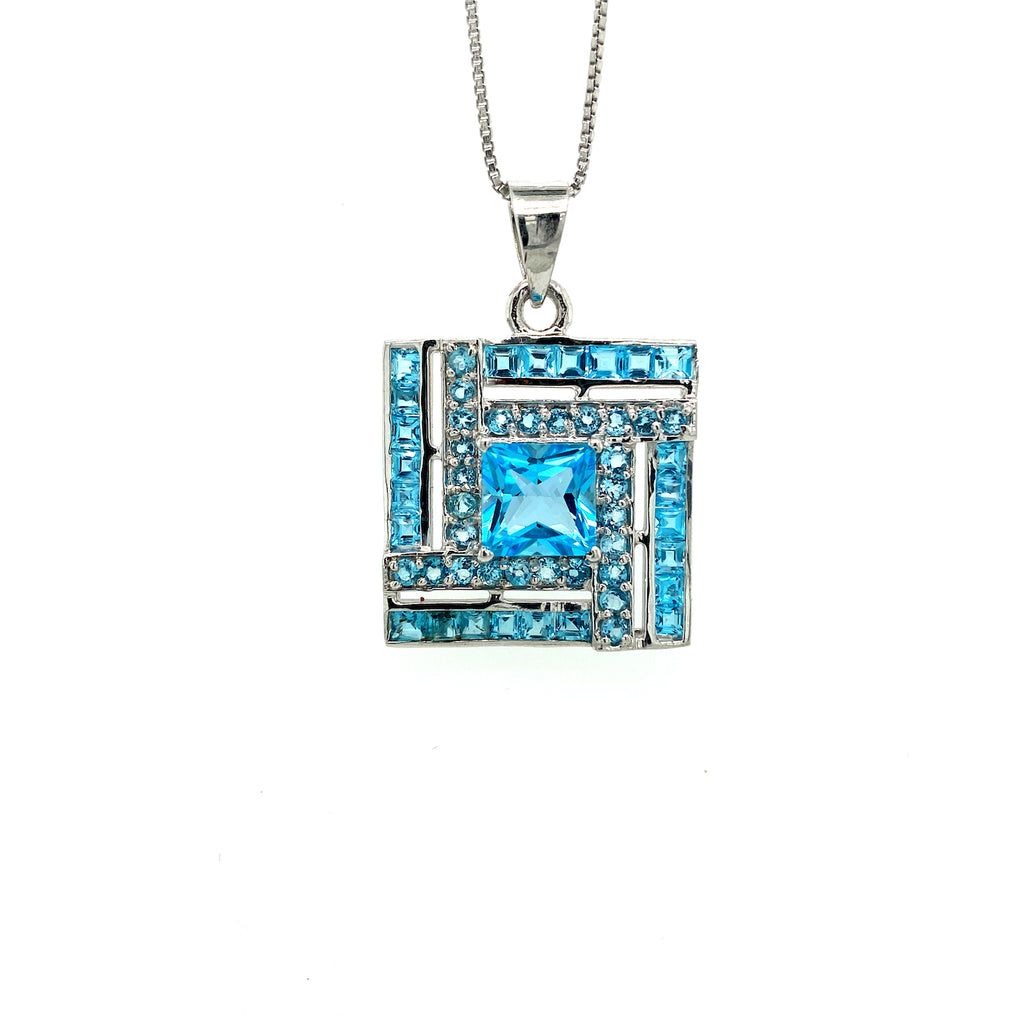 A collection of fine blue topaz coming together forming a beautiful form. The pendant adds a splash of color to your outfit.