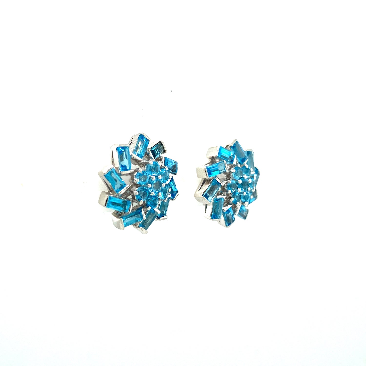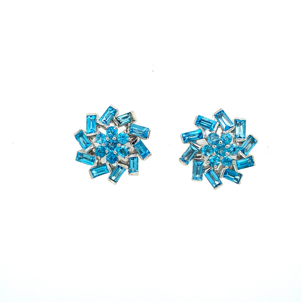 Scintillating round and baguette blue topaz form mandalas for these stud earrings that radiate light all around.