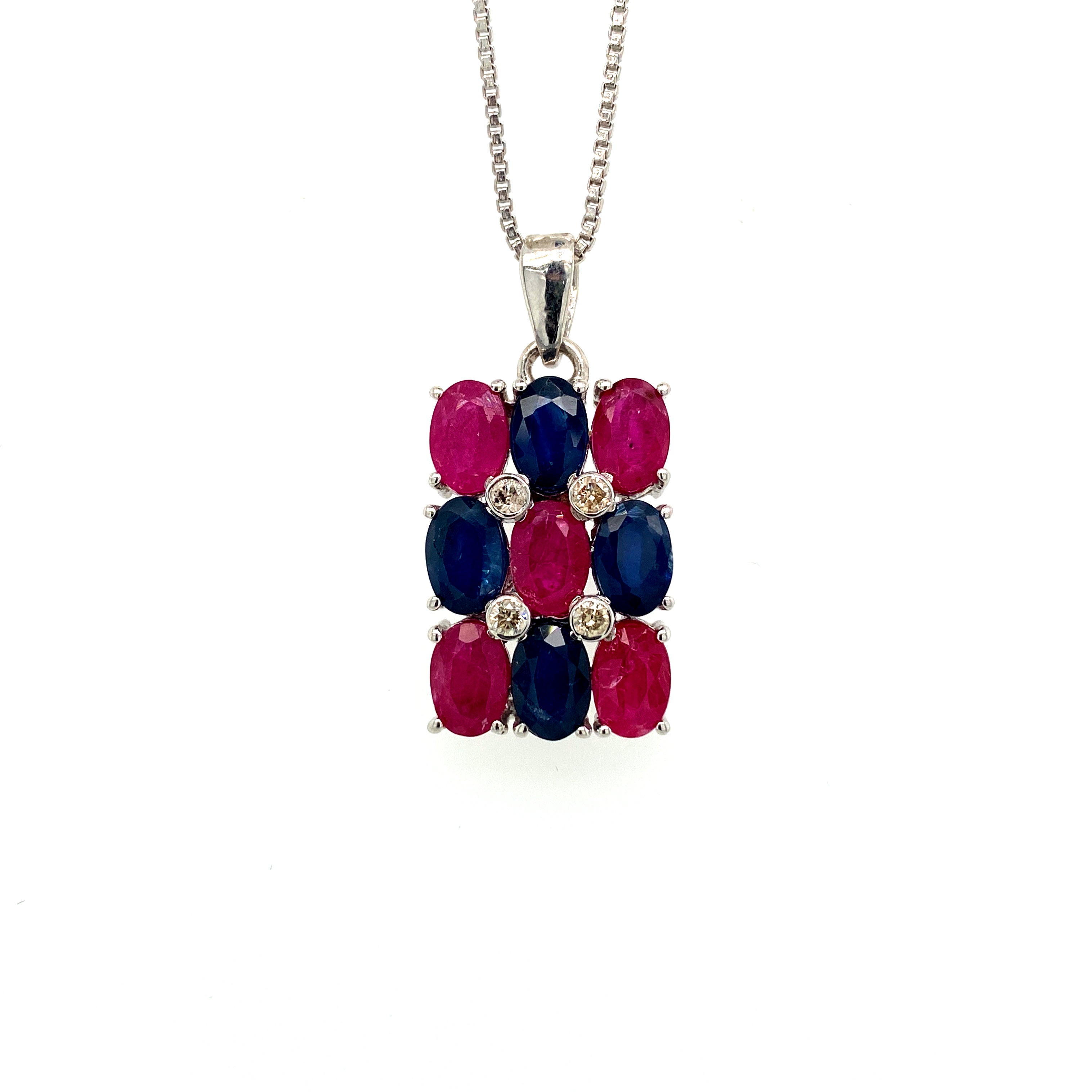 A collection of fine sapphires and rubies adorned with petite diamonds coming together forming an intricate design. The pendant adds a splash of color to your outfit.
