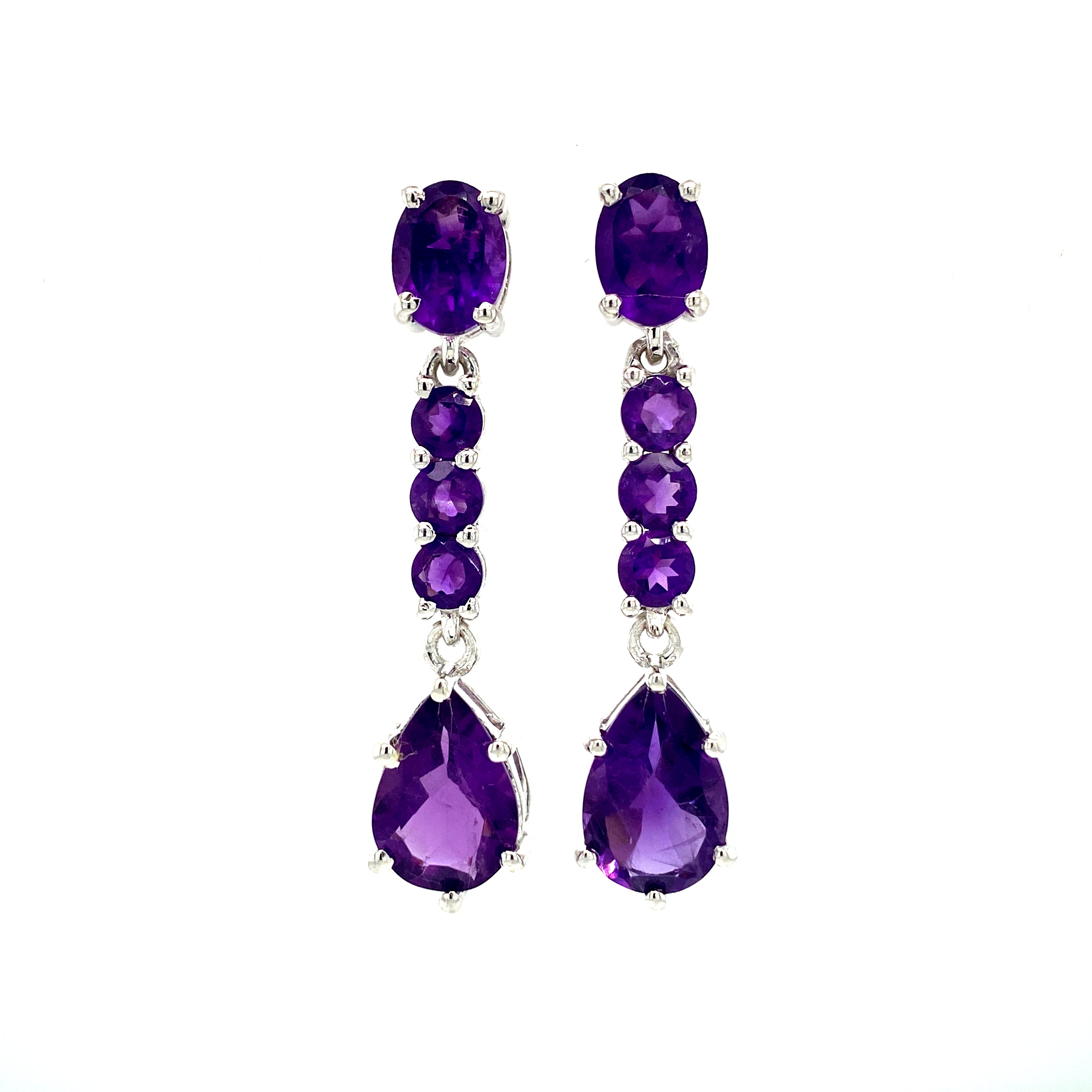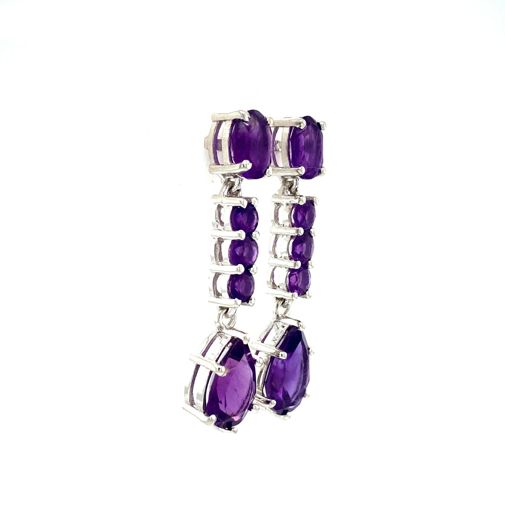Drop earrings that feature a strand of different shapes of amethysts that are meticulously crafted with precision.