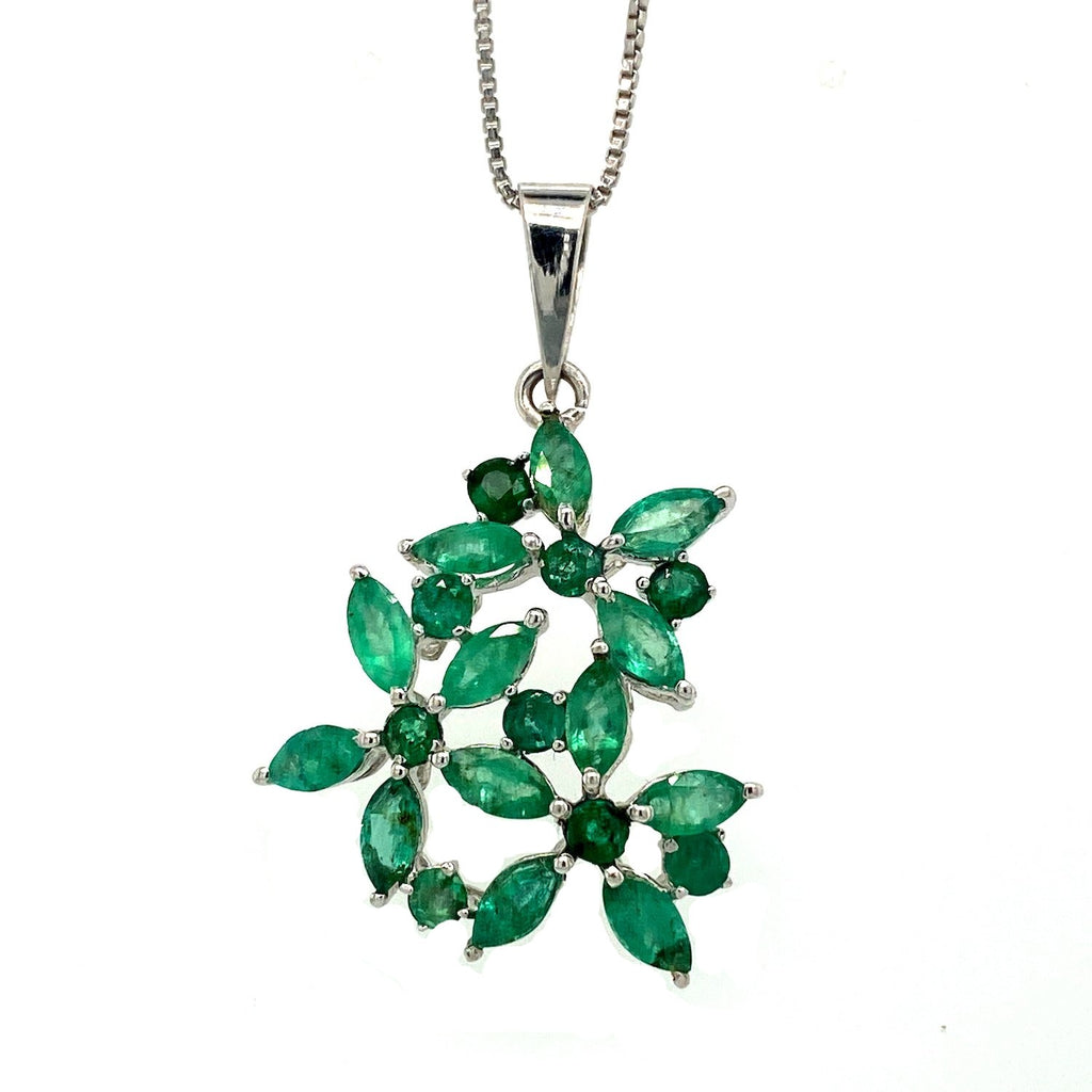 A collection of fine emeralds coming together forming a floral design. The pendant adds a splash of color to your outfit.