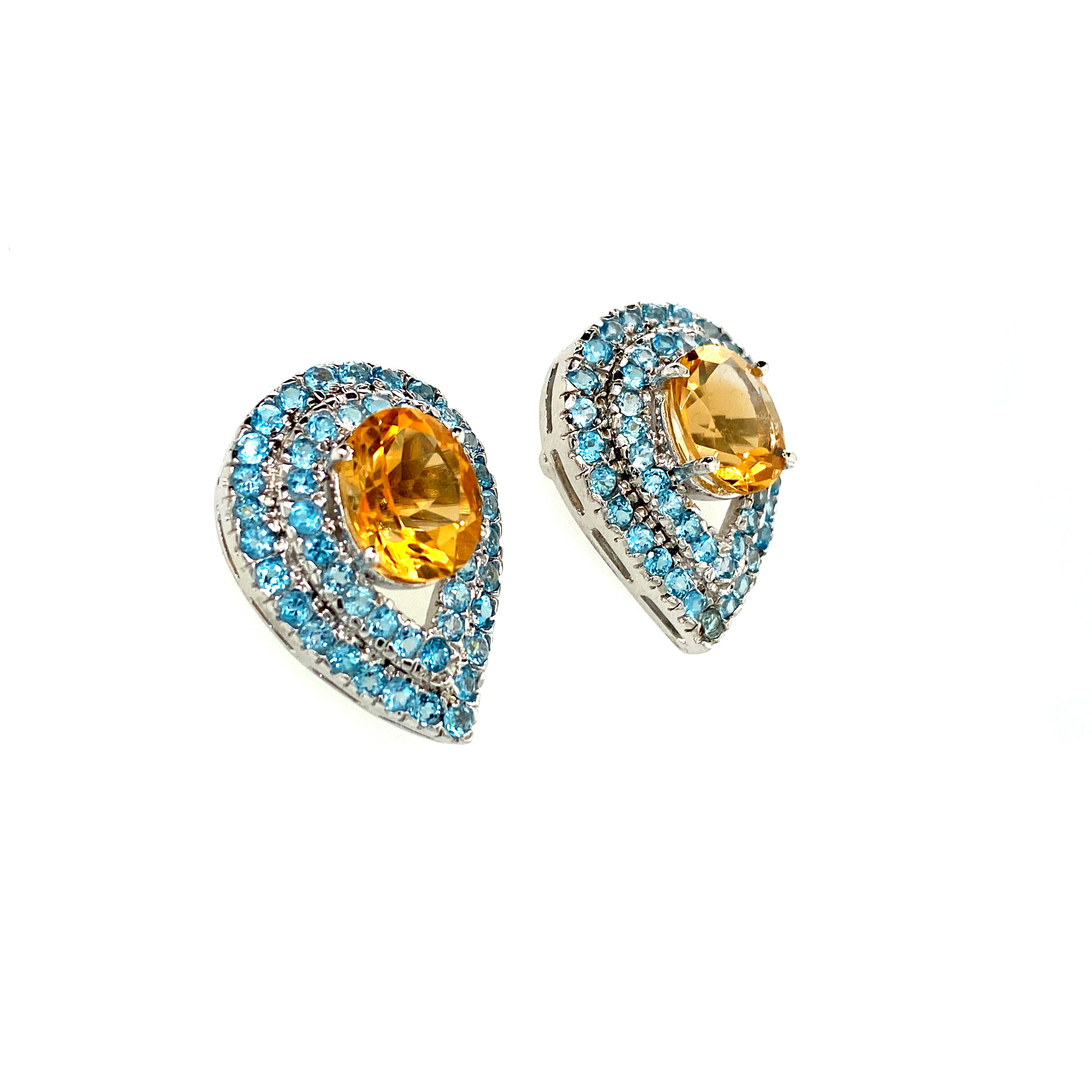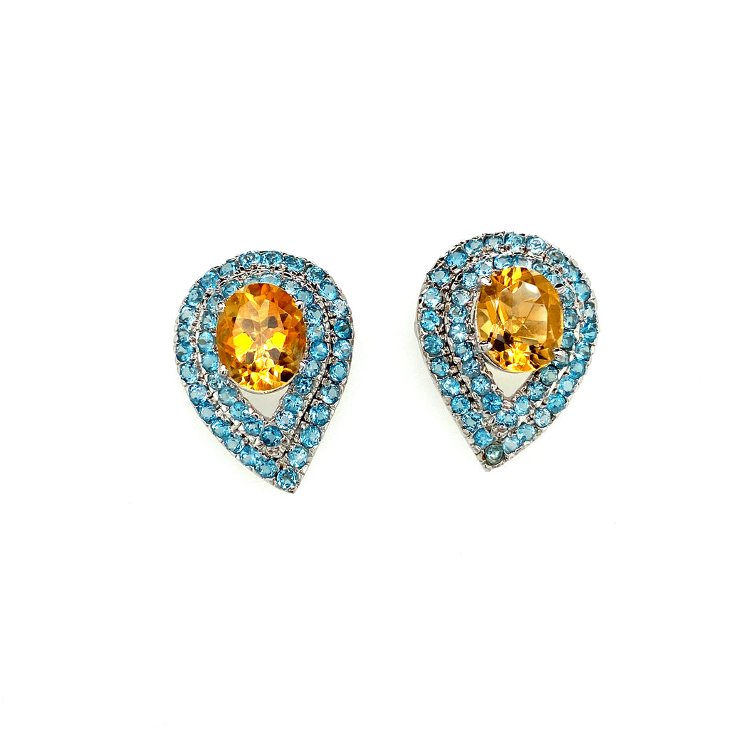 Scintillating citrines and blue topaz form these stud earrings that radiate light all around.